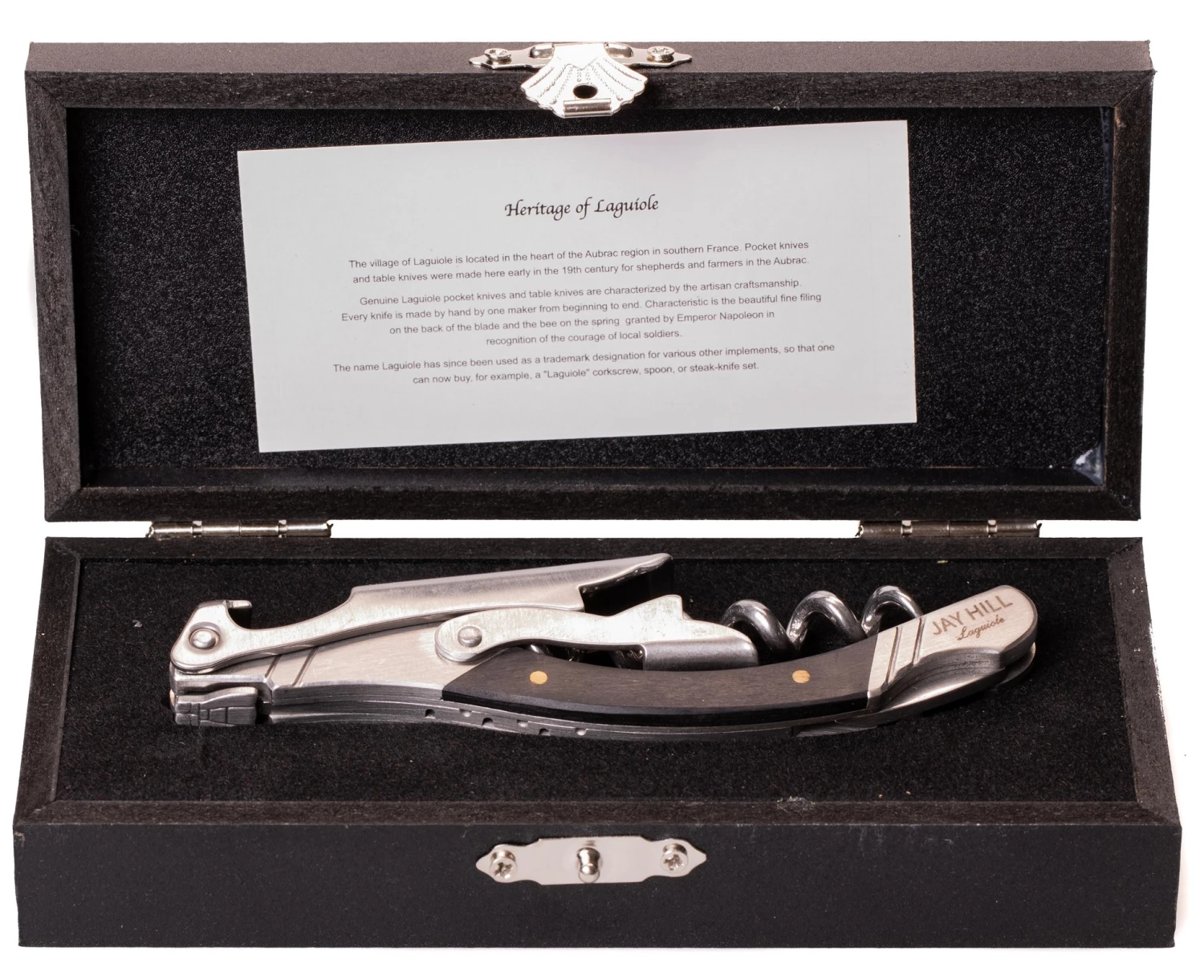 Zoek jij een kurkentrekker van kwaliteit met een mooi design? Deze multifunctionele Laguiole kurkentrekker van Jay Hill heeft een ergonomisch design met een stijlvolle look. Het handvat is gemaakt van modern zwart ebbenhout. Naast het scherpe lemmet is het zakmes ook voorzien van een kurkentrekker en handige flessenopener. Wil je deze kurkentrekker cadeau geven? De Jay Hill kurkentrekker wordt geleverd in een luxe houten kist met mooie geschenkverpakking.