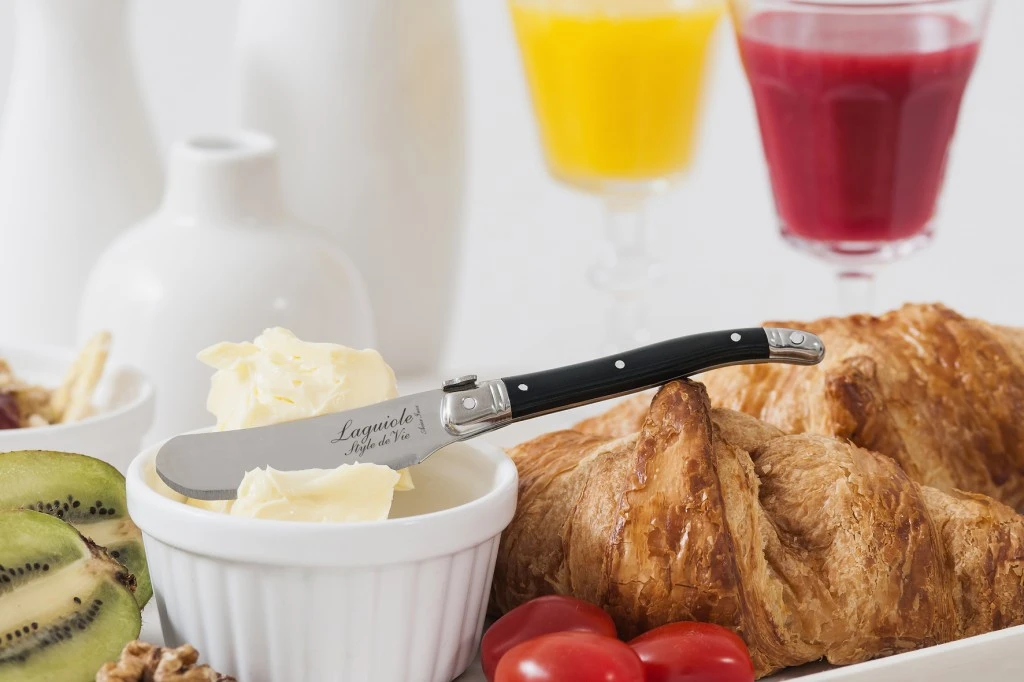 Uw ontbijt verdient een mooi opgemaakte tafel. Daarvoor zijn deze botermessen van Laguiole de ideale aanvulling. De messen zijn gemaakt van roestvrij staal en zijn vaatwasmachinebestendig. Het lemmet is glad geslepen en heeft een afgeronde punt zodat uw brood niet scheurt of beschadigt. Uiteraard zijn de botermessen van Laguiole ook zeer geschikt bij borrelhapjes voor het smeren van bijvoorbeeld toastjes.