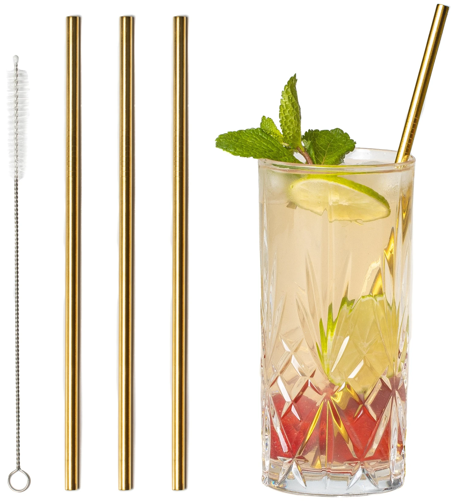 Zijn kartonnen en plastic rietjes die slap worden ook zo’n ergernis voor jou? Dat snappen wij helemaal. Met deze herbruikbare Cookinglife rietjes is een kartonnen smaak verleden tijd! Geniet optimaal van jouw drankje met deze gouden rietjes gemaakt van RVS. Deze rechte rietjes zijn 21.5 cm en daardoor ook perfect voor hoge glazen, zoals longdrinkglazen. De set bestaat uit 4 stuks.
