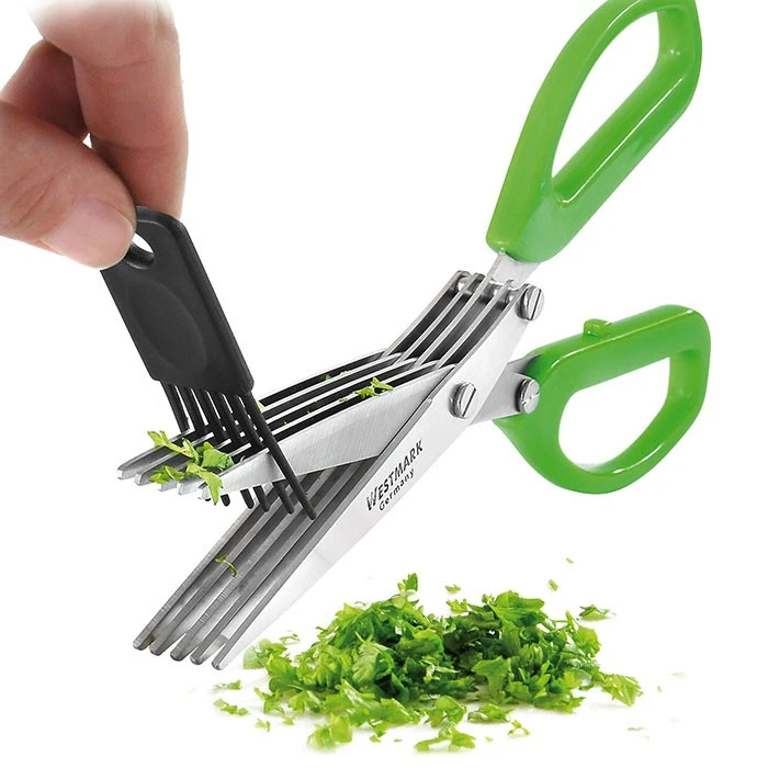 De Westmark kruidenschaar is perfect voor het snel knippen van allerlei kruiden. Met de vijf roestvrijstalen bladen is het knippen van kruiden een fluitje van een cent. Daarnaast krijg je er een handig kammetje bij waarmee je de schaar makkelijk schoon kunt maken. Koken met verse kruiden wordt zo een eitje!
