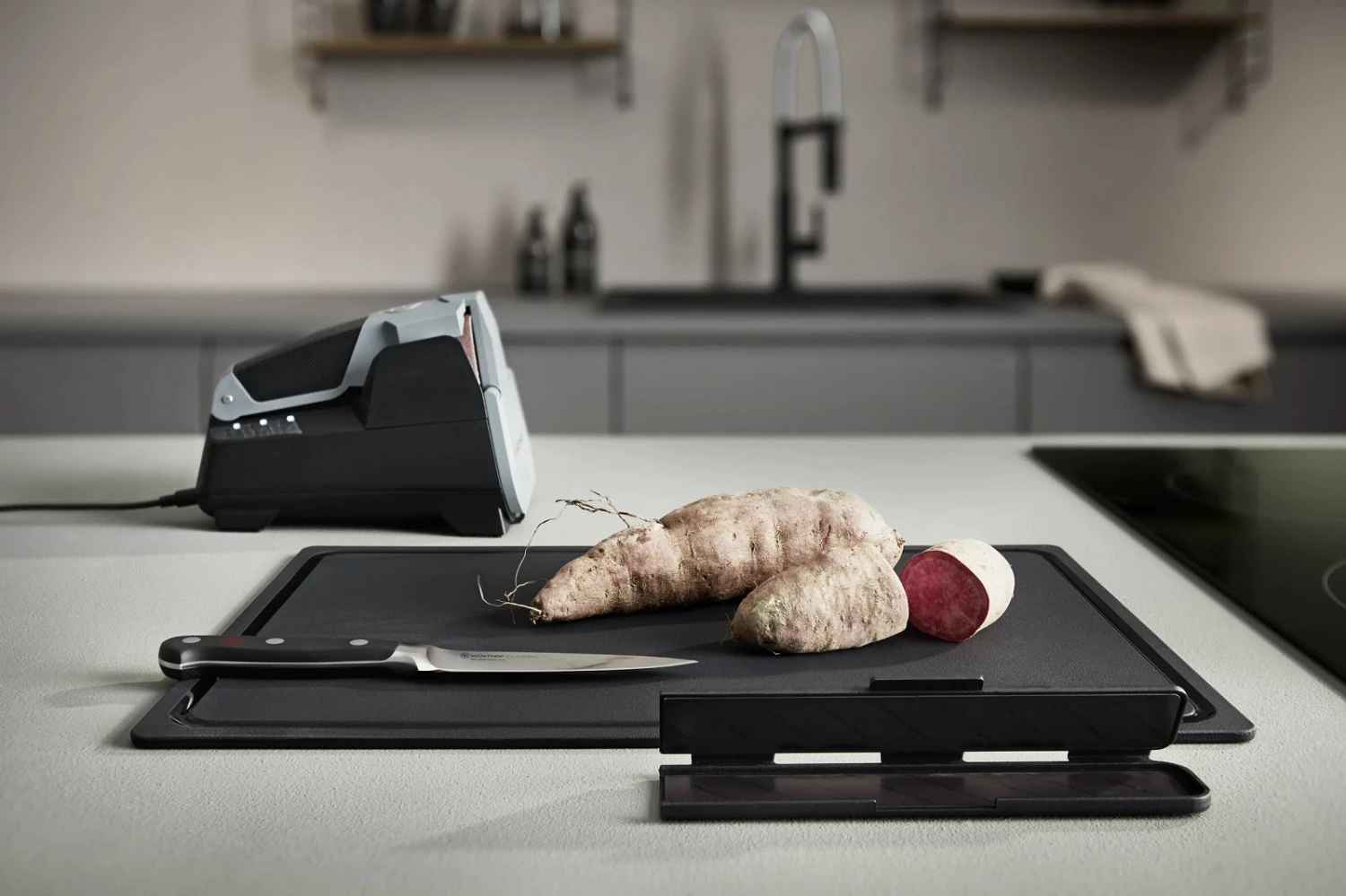 Slijp je messen binnen no-time weer als nieuw met de Wusthof Messenslijper – elektrisch – Easy Edge! De elektrische messenslijper heeft 3 fasen: